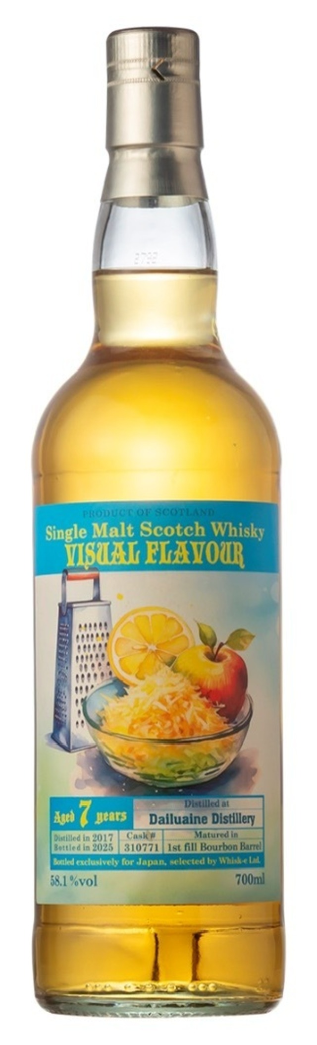 [ご購入にあたって] ・お一人様1本限り。 ・入荷本数が少ない場合は抽選販売となり、落選された方の注文はキャンセルとなります。 [商品説明文] ファーストフィルバーボンバレルの7年熟成で、シングルカスクのカスクストレングスボトリング。このカスクを象徴するフレーバーは「すりおろしリンゴとレモン」。 色はペールゴールド。グラスに注ぐと、フレッシュレモンのほのかにビターさを伴う爽やかなアロマが立ちのぼり、続いてリンゴやホワイトペッパー、花山椒のニュアンスが広がる。 空気と触れることで、やがてキャラメルの甘い香りが顔を覗かせる。口に含むと、ほんのりとした甘味とともにやや粘性を感じるテクスチャー。もぎたてリンゴをすりおろしたようなジューシーでフルーティな味わいが口いっぱいに広がり、綿あめやペッパーの要素が重なる。 オーク、麦わらのアクセントが加わることで、温かみのある果実味が一層引き立ちます。 ラベルに描かれた「すりおろしリンゴ」と「レモン」を思わせるフレッシュでフルーティなフレーバーが魅了の一本。 「ヴィジュアルフレーバー」はウイスキーのフレーバーを視覚でも分かりやすく表したシリーズ。ラベルには、そのウイスキーのキーとなるフレーバーが描かれ、味覚、視覚の両面からウイスキーが楽しめる。 [テイスティングコメント] 色:ペールゴールド 香り:フレッシュレモン、リンゴ、ホワイトペッパー、花山椒、キャラメル 味: すりおろしリンゴ、綿あめ、ペッパー、オーク、麦わら [商品仕様] 度数:58.1% 主な原材料:モルト 容量:700ml 原産地:スコットランド(スペイサイド) 商品専用箱:✕