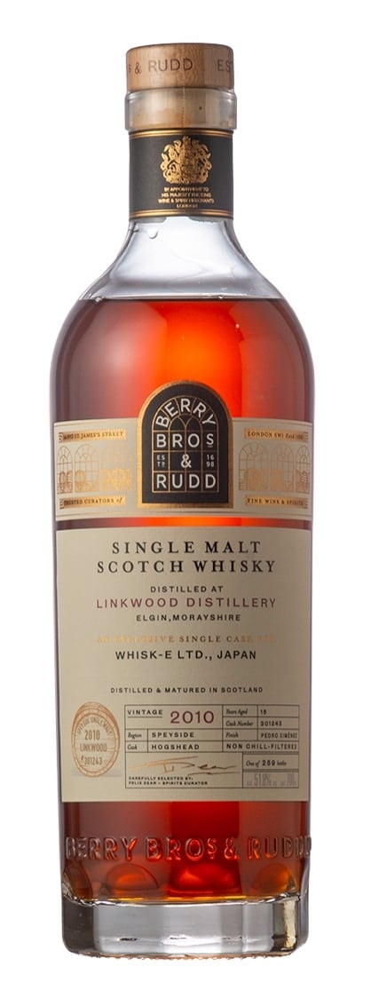 ペドロヒメネス(PX)シェリーホグスヘッドで4年追熟した15年熟成で、シングルカスクのカスクストレングスボトリング。リンクウッドの華やかな酒質とPXシェリー樽由来の濃厚な個性が見事に調和した1本。